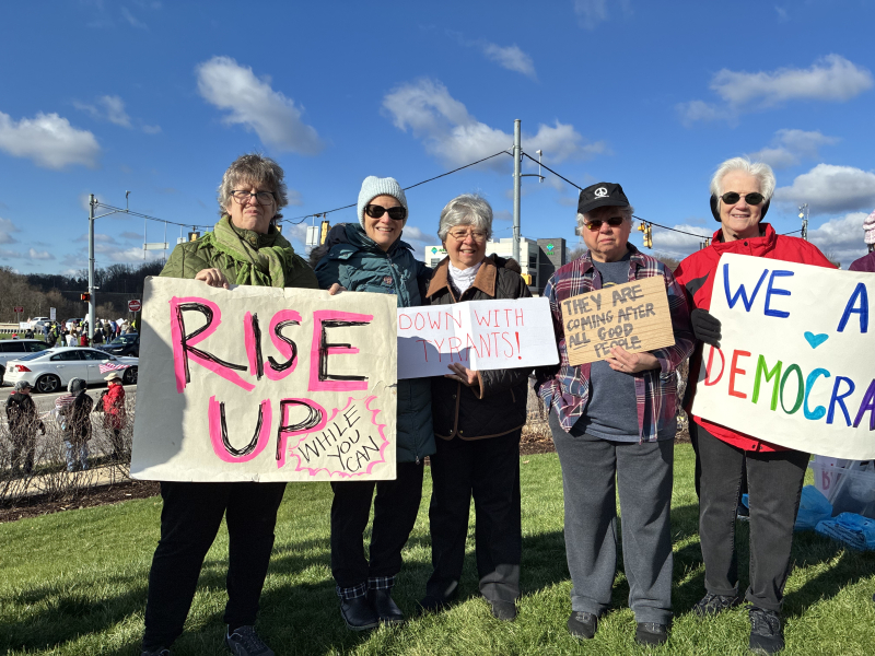 On March 28, 2026, Sisters and Associates joined the nationwide day of nonviolent action, No Kings, at the corner of McKnight Road and Duncan Avenue in the North Hills of Pittsburgh. The No Kings events began in 2025 to oppose the authoritarian power grabs, immigration policies and military actions of the Donald Trump administration.